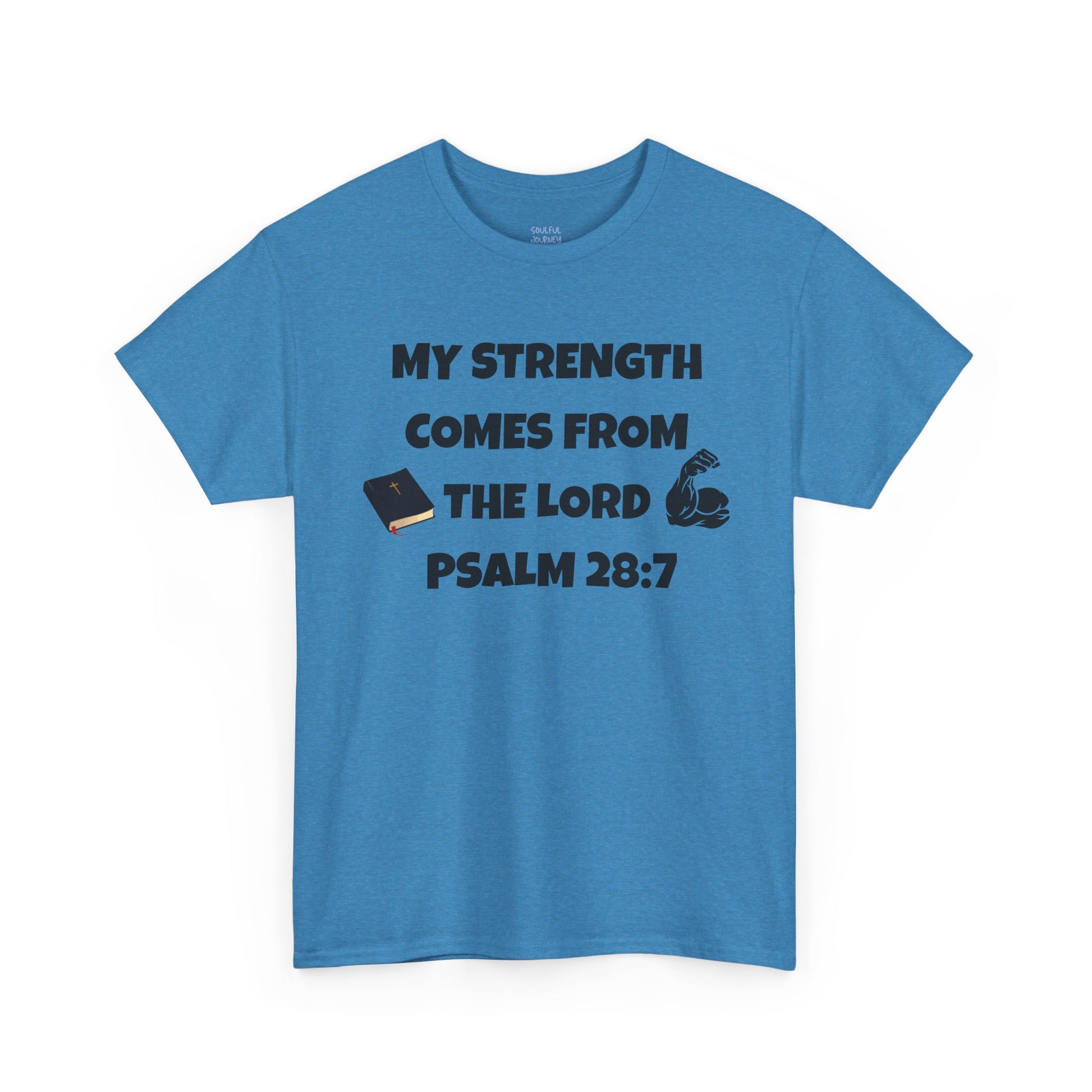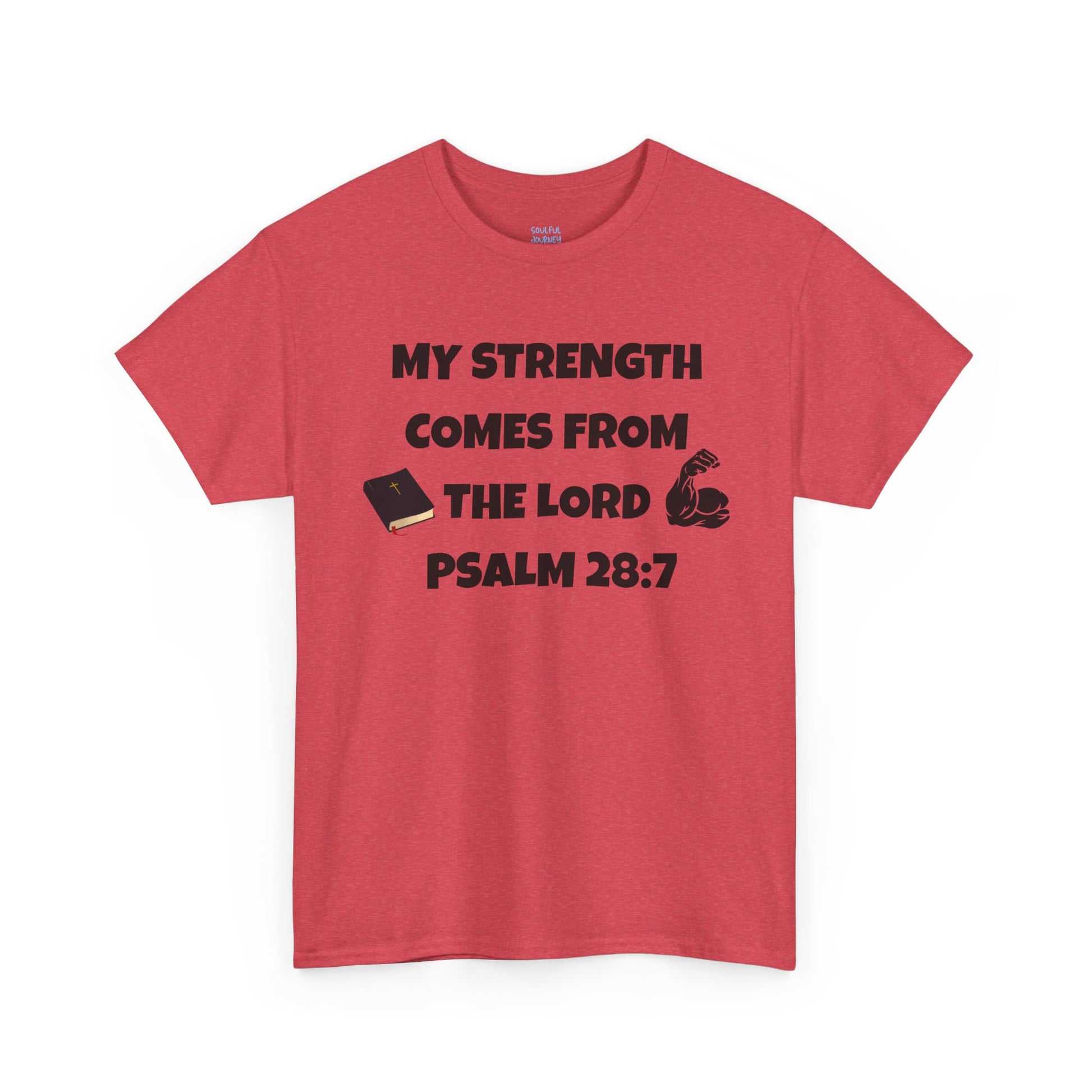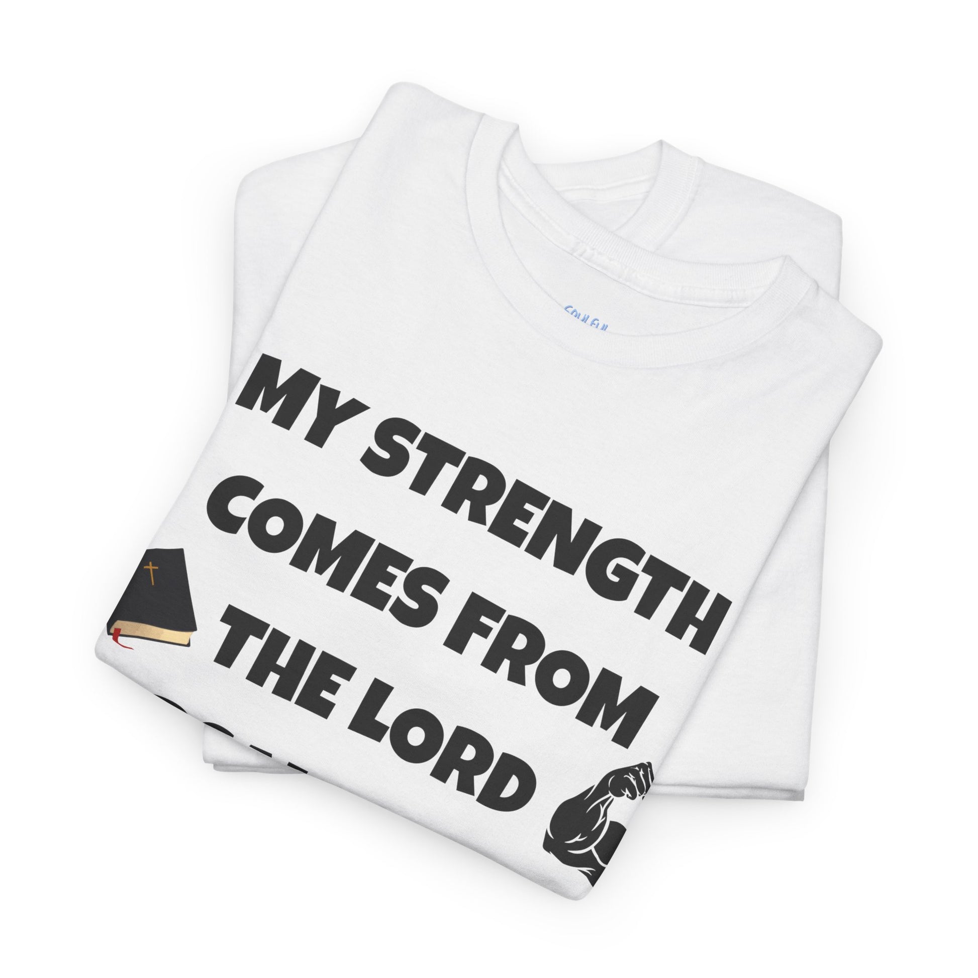 This heavy cotton T-Shirt is a symbol of strength with its, 'My strength comes from the Lord' design. The perfect blend of comfort and durability, it is ideal for those who seek a timeless, casual tee that can be worn year-round. Suitable for adults, this tee is made with sustainable and ethically grown US cotton, meeting all flammability and safety standards. Whether worn for everyday activities or special occasions, this tee exudes a classic vibe that resonates with faith and resilience.