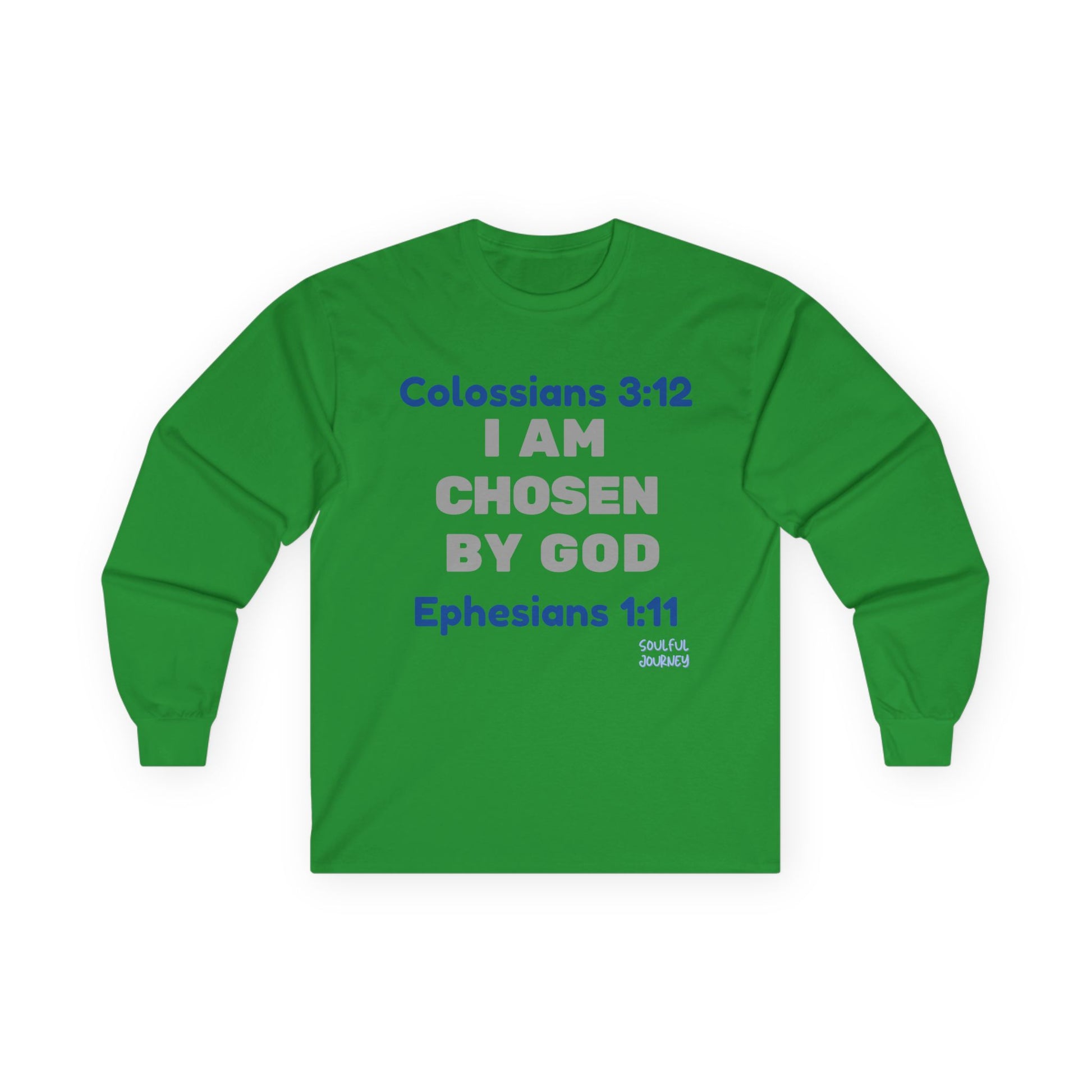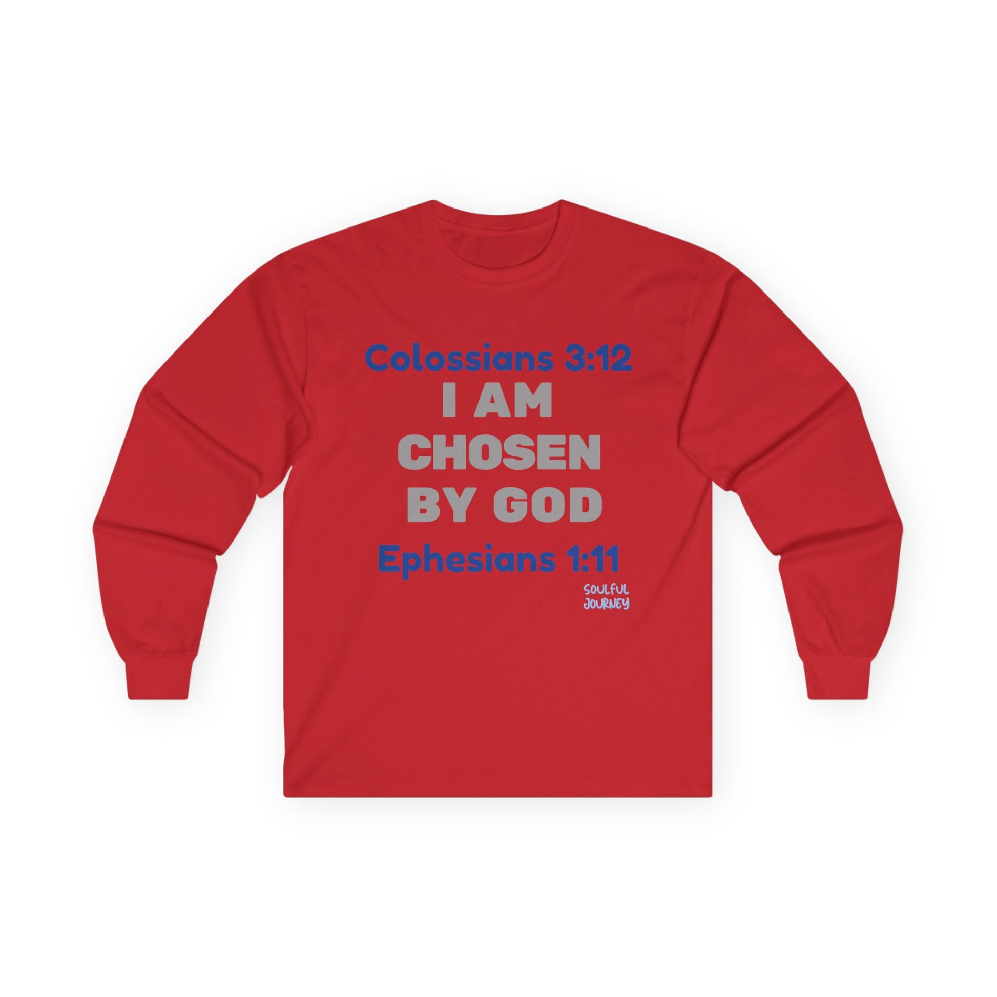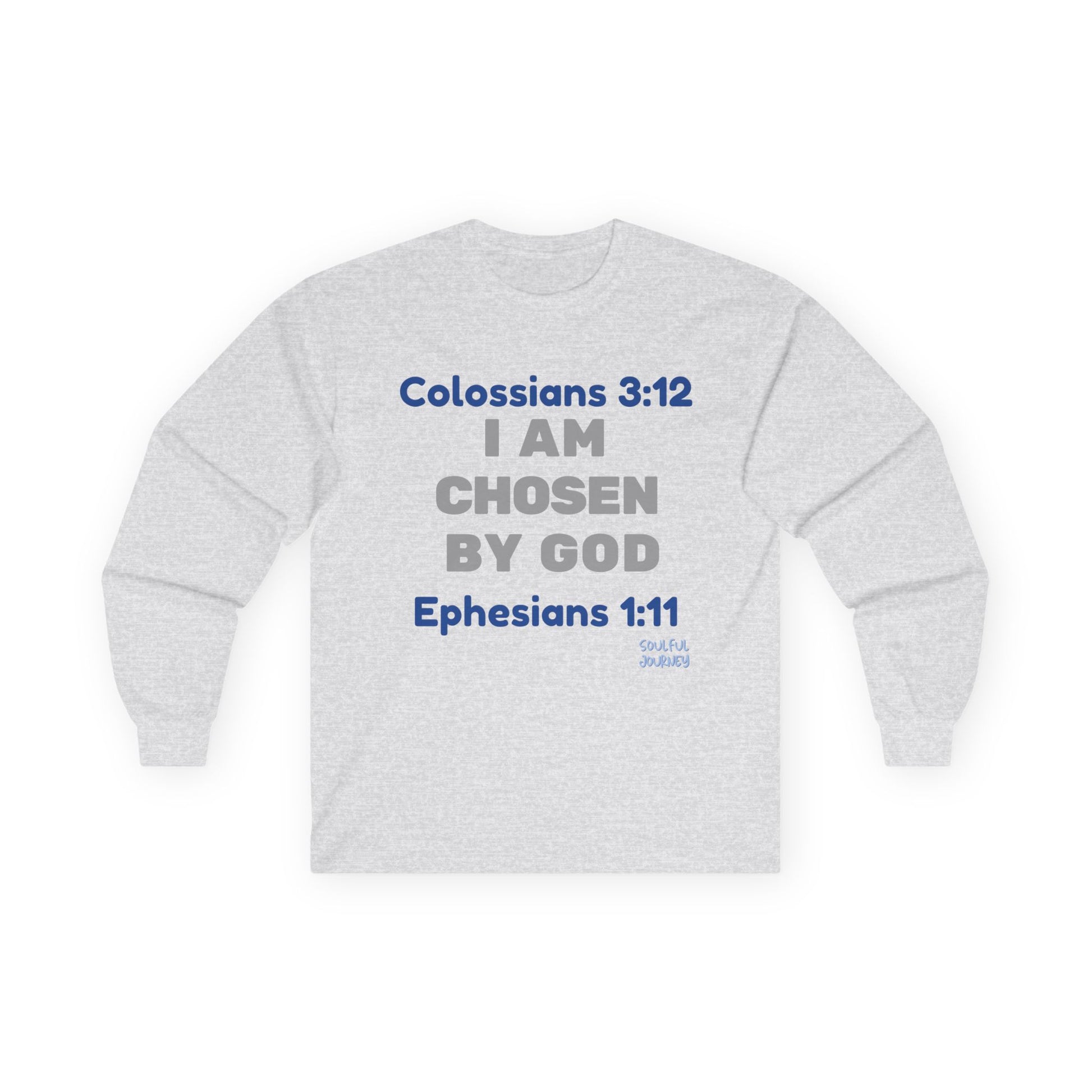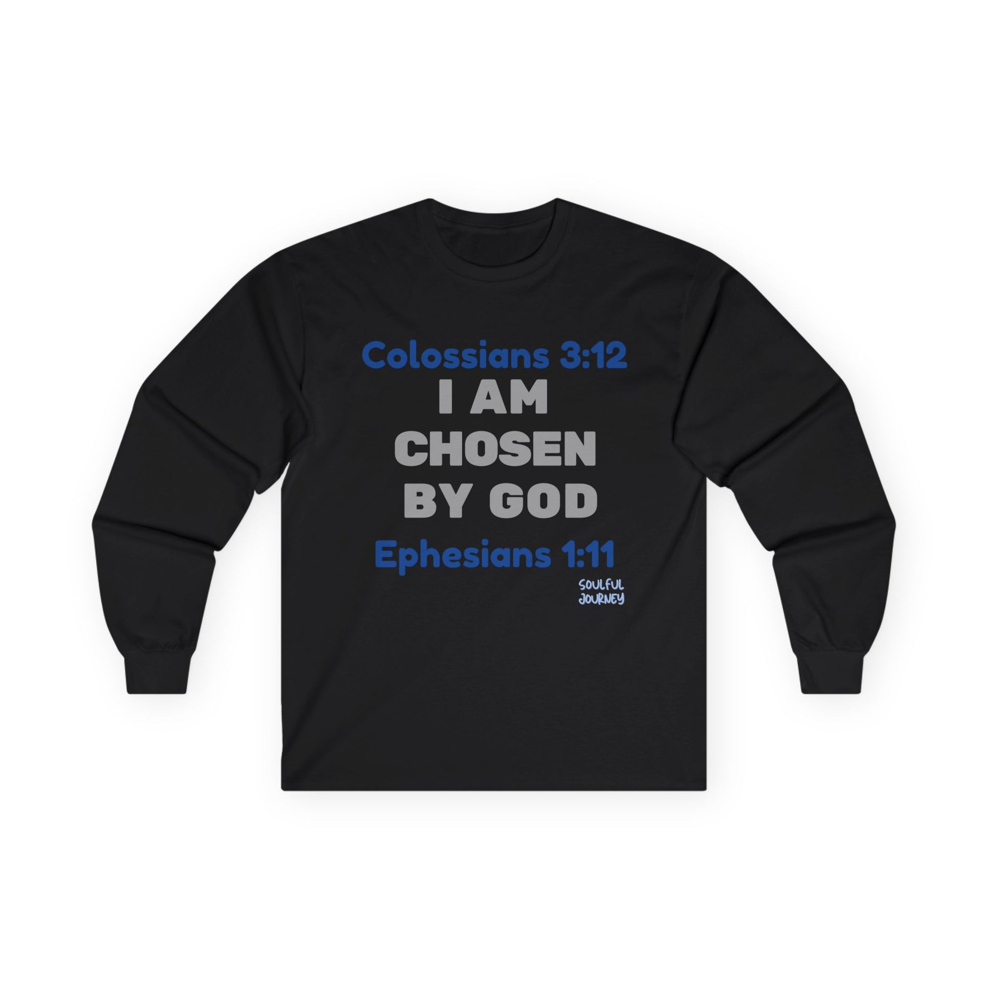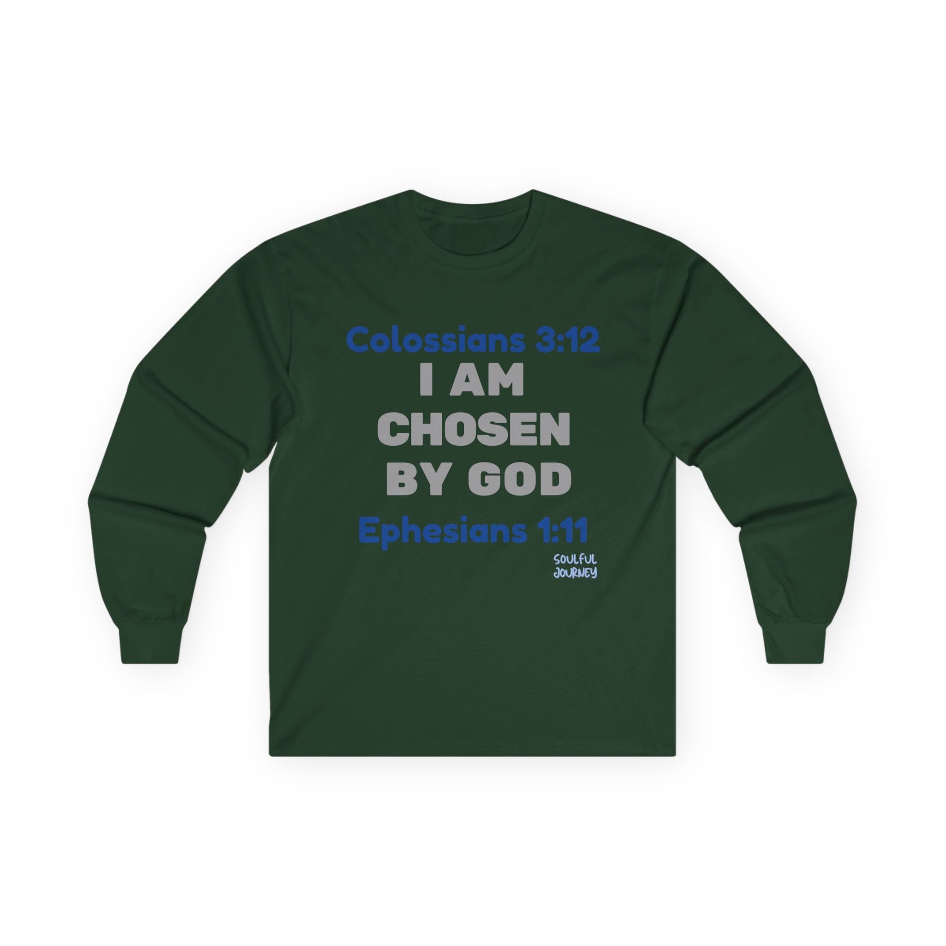 This t-shirt for men, features the design, 'I Am Chosen, reminding men that they have been chosen by God! Colossions 3:12 & Ephesians 3:12